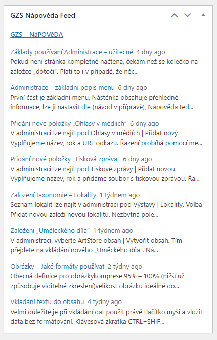 Novinky z nápovědy pro Administrační rozhraní webu GZS jsou nově na nástěnce. Je zde zobrazeno 8 nejnovějších příspěvků. Prosím nastavte si ji proto na nástěnce na viditelném místě. Bude se hodit ! Hlavně je nutné vědět o změnách a takto se dají jednoduše sledovat. Děkuji