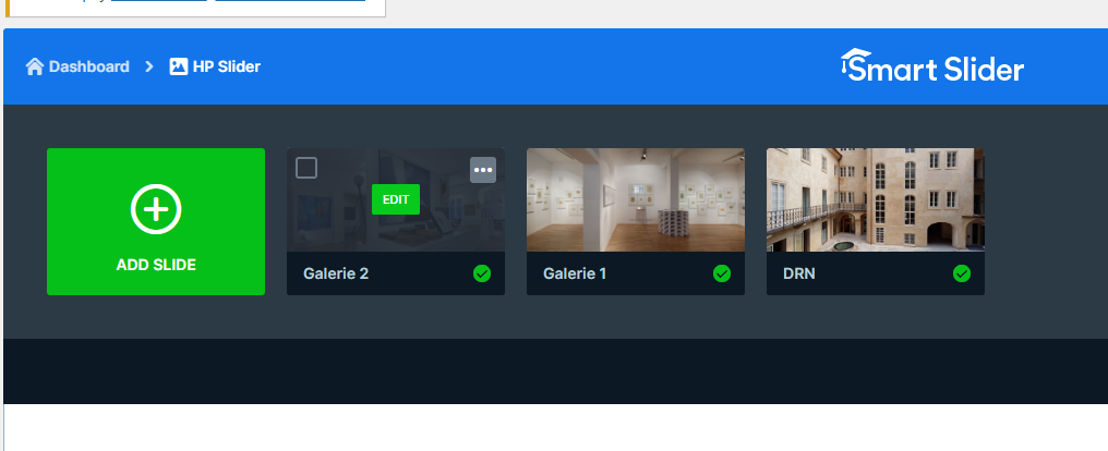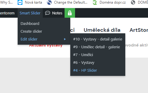 V horním menu vyberte Smart Slider | Edit Slider | #4 – HP Slider, ostatní slidery prosím neupravujte generují se automaticky.