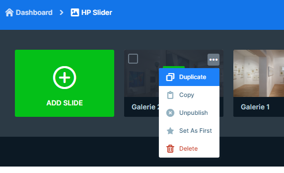 Pokud chcete přidat další slide, doporučuji vytvořit kopii pomocí třech teček vpravo vedle tlačítka edit a zvolte Duplicate. Tím se zkopíruje vybraný slide i včetně všech nastavení a není tak nutné vše znovu nastavovat.